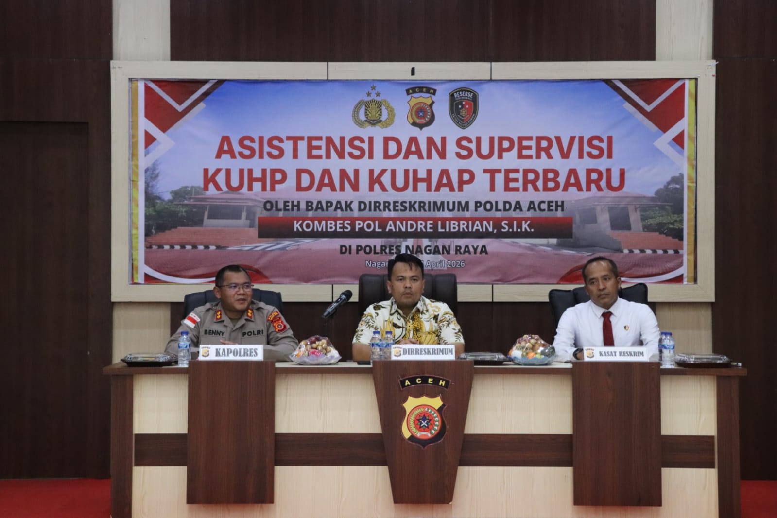 NAGAN RAYA,GEMADIKA.com – Dalam rangka meningkatkan profesionalisme dan kualitas penegakan hukum, Direktorat Reserse Kriminal Umum (Ditreskrimum) Polda Aceh melaksanakan kegiatan asistensi dan supervisi terkait penerapan KUHP dan KUHAP terbaru di Polres Nagan Raya, Jum’at 24 April 2026.