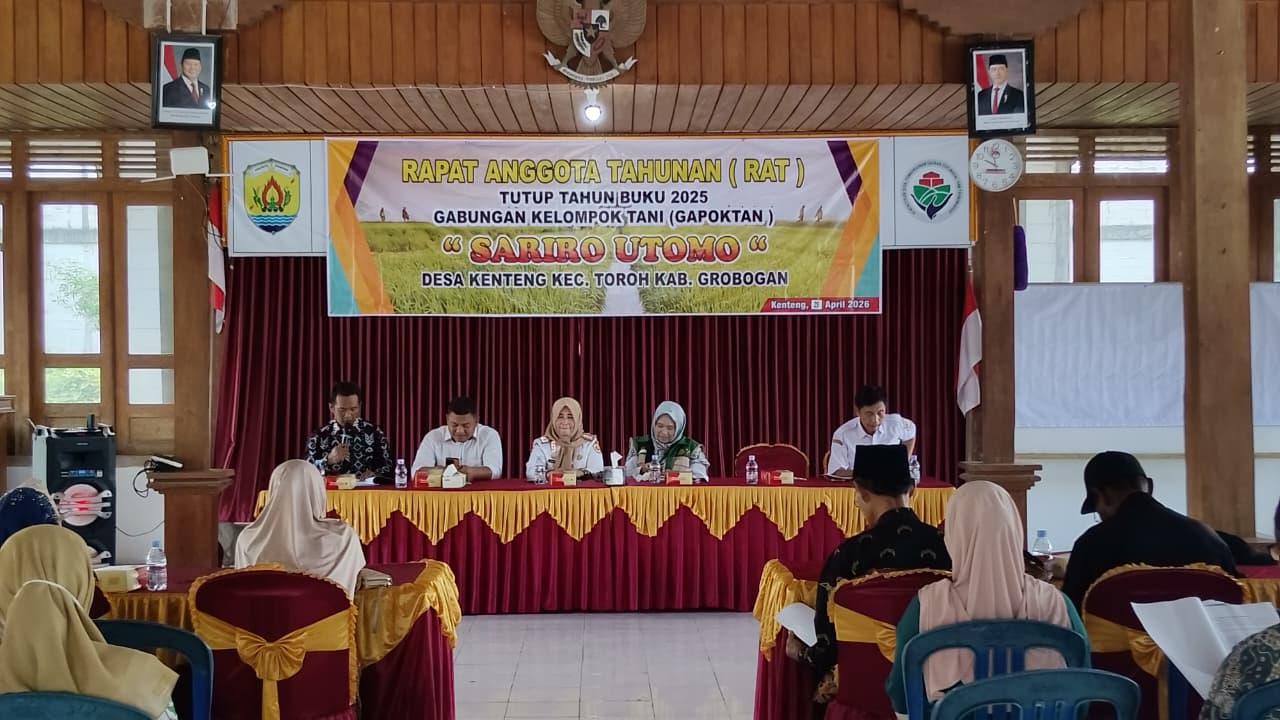 GROBOGAN, GEMADIKA.com – Suasana Pendopo Balai Desa Kenteng, Kecamatan Toroh, Kabupaten Grobogan, tampak ramai dan hangat, Senin pagi. Para petani anggota Gabungan Kelompok Tani (Gapoktan) Sariro Utomo berkumpul menggelar Rapat Anggota Tahunan (RAT) Tutup Tahun Buku 2025, Rabu (29/04/2026).